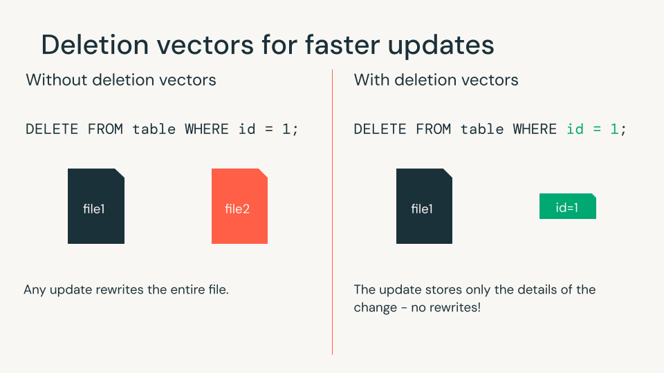 Deletion vectors enable deleting or updating rows without rewriting Parquet files. Instead, deletes are stored as separate files and merged during reads. Most data engineering workloads modify only a few rows at a time, making this a critical feature for efficient writes.