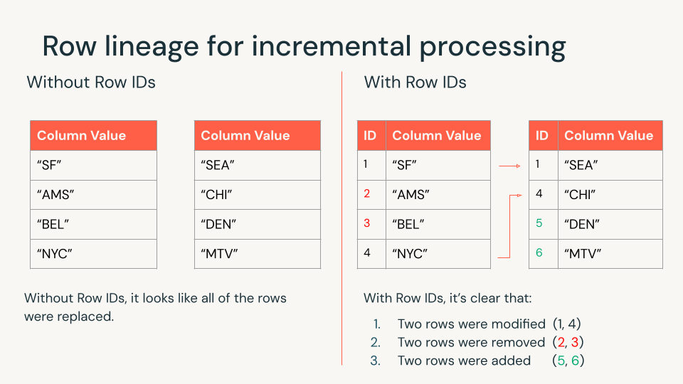 Row lineage gives each row a unique ID, making it easy to track changes over time. That means you process only what has changed instead of reprocessing everything, which improves efficiency and lowers costs. Row lineage is enabled on all Iceberg v3 tables.