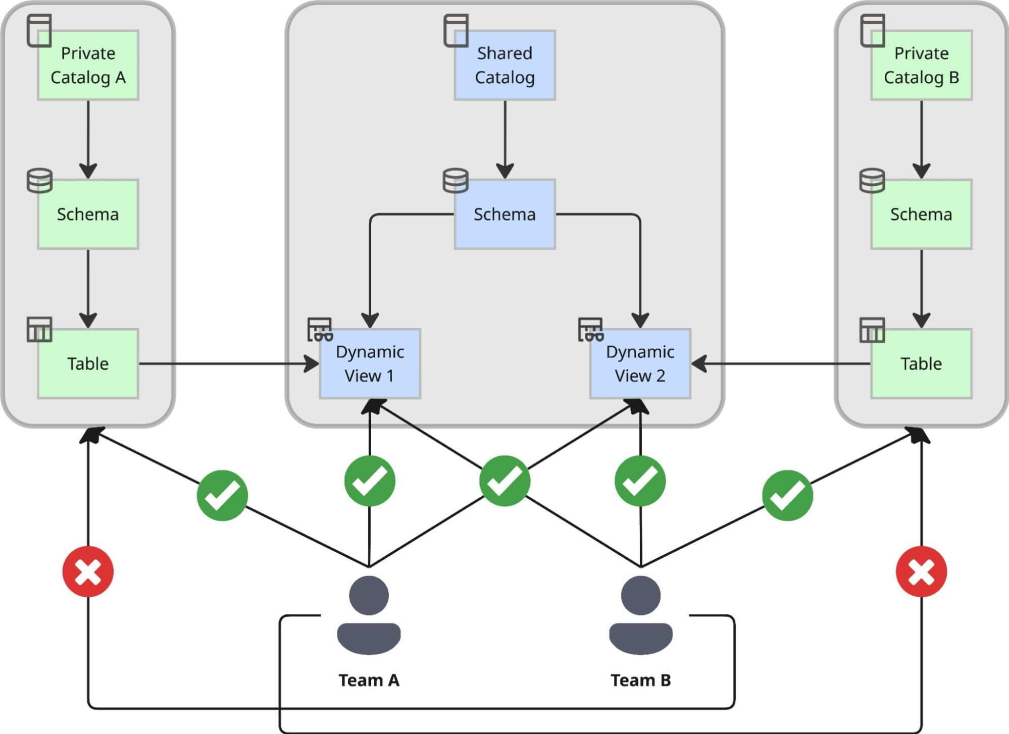 We made a strategic decision to expose data in the shared catalog exclusively via Dynamic Views, rather than direct table pointers. This approach allows us to enforce a centralized access process capable of handling complex compliance rules.
