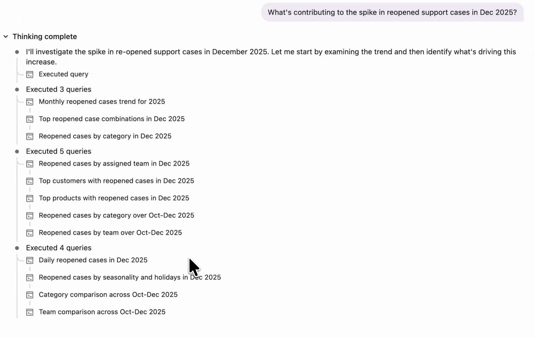 For example, imagine a Genie space for customer support. You notice a spike in reopened cases in December 2025 and ask: “What’s contributing to the spike in reopened support cases?”