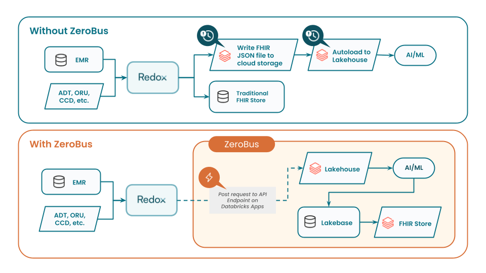 With Zerobus, clinical data arrives in Databricks with subsecond latency without intermediate storage layers or batch processing. This allows FHIR to be treated like it was always meant to be treated–as transactional and sent to REST API endpoints. For example, a health plan or provider organization can send prior authorization specific bundles through Redox directly to a dedicated REST API endpoint where it needs to be in Databricks instead of landing in a FHIR Store or as a substantiated FHIR JSON file first.