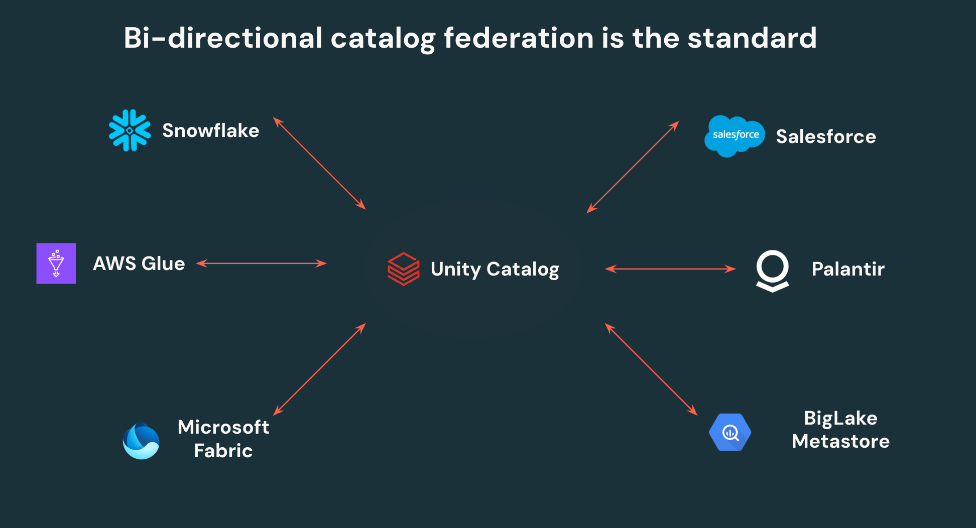 Unity Catalog's open APIs allow customers to write once and read anywhere - no more data duplication or siloed access controls. UC can federate to other Iceberg catalogs, enabling bi-directional interoperability. All Iceberg data in Snowflake, AWS Glue, Salesforce, and other major catalogs, can be read by Unity Catalog, and all data in UC can be accessed by those same third party platforms via open APIs.