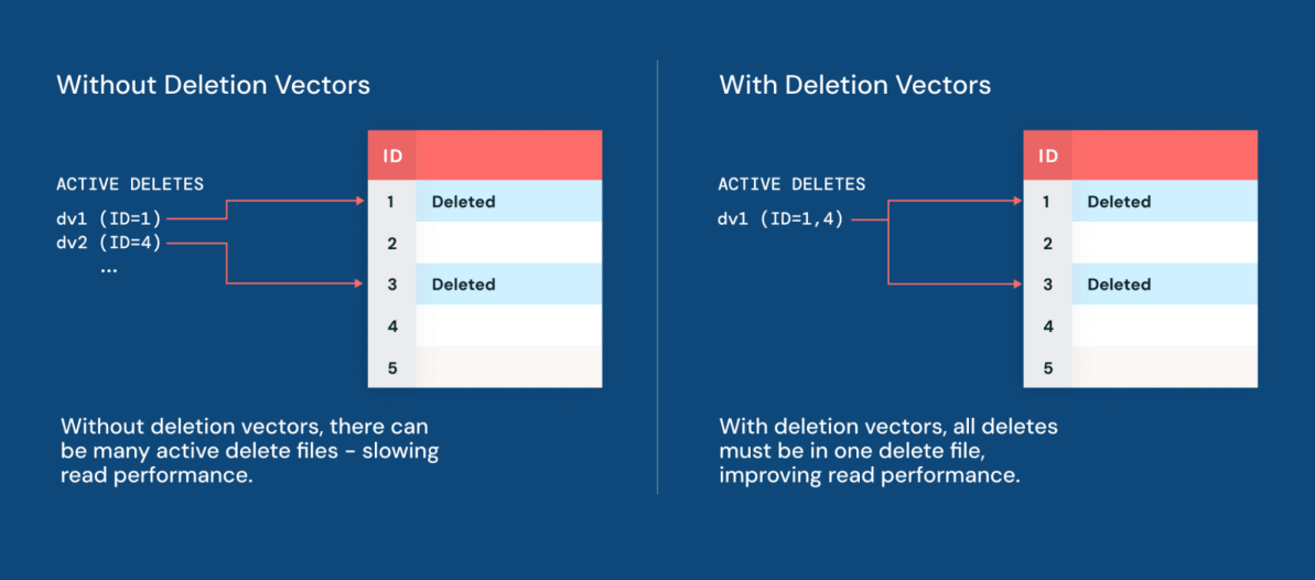 Additionally, deletion vectors make applying changes to datasets more performant than ever. Deletion vectors allow Iceberg to track which rows have been logically deleted without immediately rewriting the underlying data files. Instead of physically deleting rows by rewriting large Parquet files, the engine writes a lightweight delete file alongside the data. The result is data manipulation performance that is up to 10x faster than the traditional copy-on-write approach.