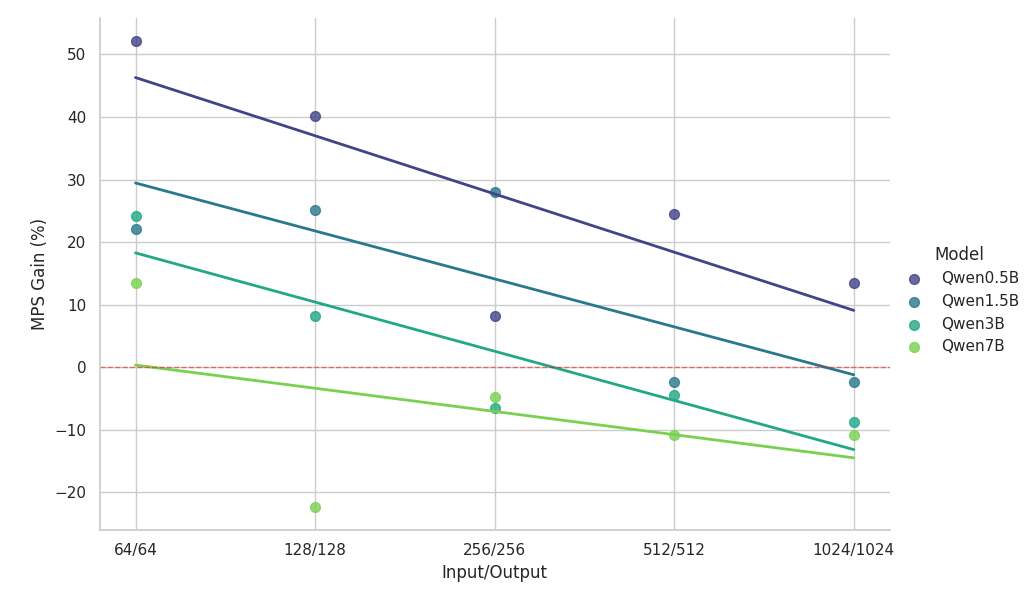 - Small Models (<3B): MPS consistently delivers a throughput improvement of over 100%.