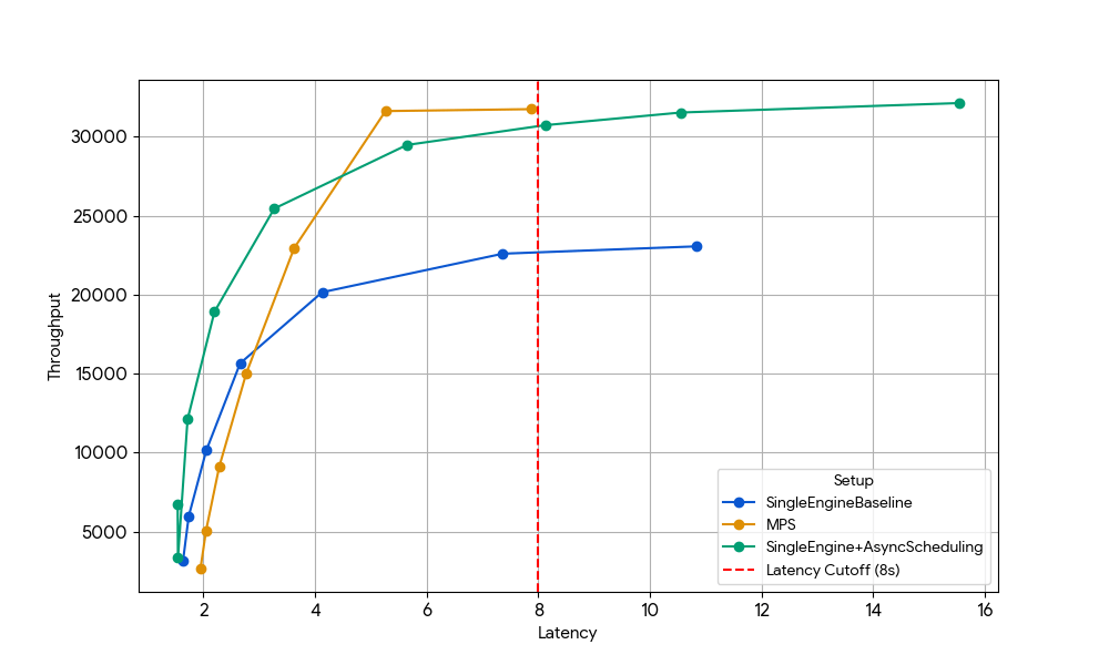 At a latency of 8s, the baseline single engine (blue) is limited by the scheduler CPU overhead, which can be lifted by either enabling asynchronous scheduling in vLLM (green line, +33% throughput), or running two engines with MPS without asynchronous scheduling (yellow line, +35% throughput). This near-identical gain confirms that, in CPU-constrained scenarios, MPS can reclaim essentially the same idle GPU time that async scheduling eliminates. MPS can be useful since vanilla vLLM v1.0 still has CPU overhead in the scheduler layer where optimizations like asynchronous scheduling are not fully available.
