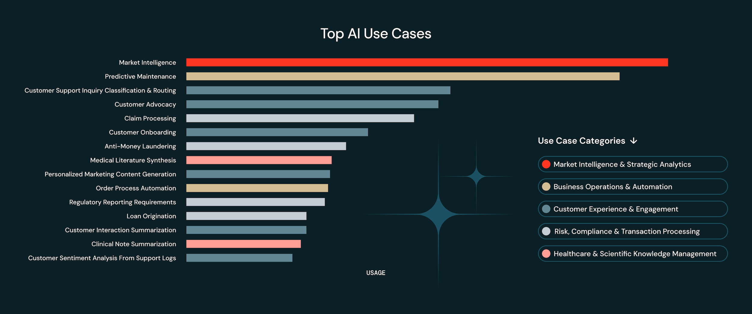 Essas tarefas variam de inteligência de mercado a defesa do cliente e relatórios regulatórios. Dos 15 principais casos de uso, 40% se concentram na experiência e no engajamento do cliente.