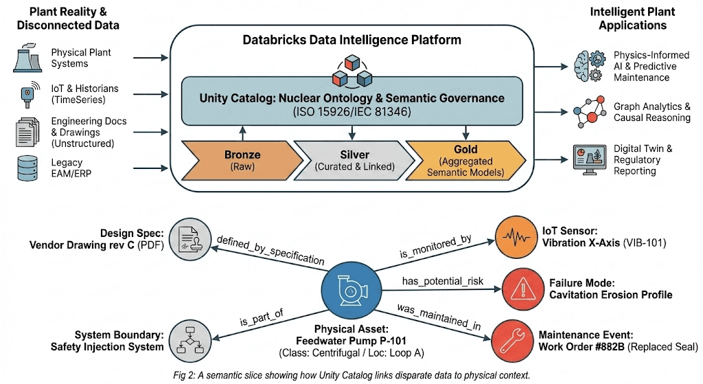 O que esses esforços compartilham é uma abordagem comum. A abordagem começa definindo os objetos sobre os quais uma planta raciocina (sistemas, componentes, sensores, documentos, restrições, compromissos de licenciamento) e, em seguida, define como eles se conectam. Uma bomba pertence a um sistema. Um sensor mede uma variável em um componente. Uma válvula define parte de um limite de isolamento. Um componente herda os requisitos de qualificação de seu local de instalação. Um compromisso de licenciamento remete às suposições de configuração que o suportam. Essa estrutura é uma ontologia.