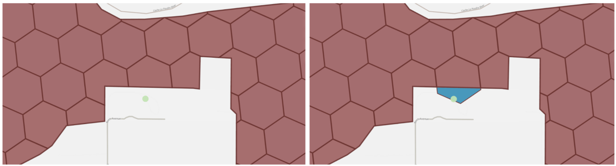 Células categorizadas como boundary (core = false) requerem uma verificação geométrica precisa porque a célula h3 não está completamente dentro da geometria do site. Podemos realizar a verificação de ponto-em-polígono usando st_contains. Isso garante que apenas pontos verdadeiramente dentro do limite do site estão incluídos nos resultados da junção, eliminando falsos positivos causados pela granularidade da resolução.