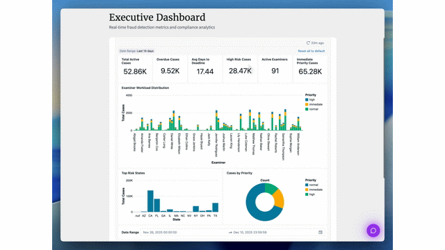 Dentro de um painel executivo construído sobre o AI/BI Genie, o Serviço de Atendimento rastreia os principais indicadores de desempenho em seu programa de fraudes. A interface é interativa. Selecionar um examinador individual atualiza automaticamente os gráficos relacionados para revelar a carga de trabalho, casos atrasados e a mistura de casos.