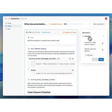 Nos bastidores, o Agent Bricks chama o Genie para executar consultas SQL em tabelas de fraude ativas. Ele invoca o agente de conhecimento para apresentar citações de políticas relevantes com referências diretas a documentos de origem e, em seguida, recupera sinais externos sobre esquemas de fraude emergentes.