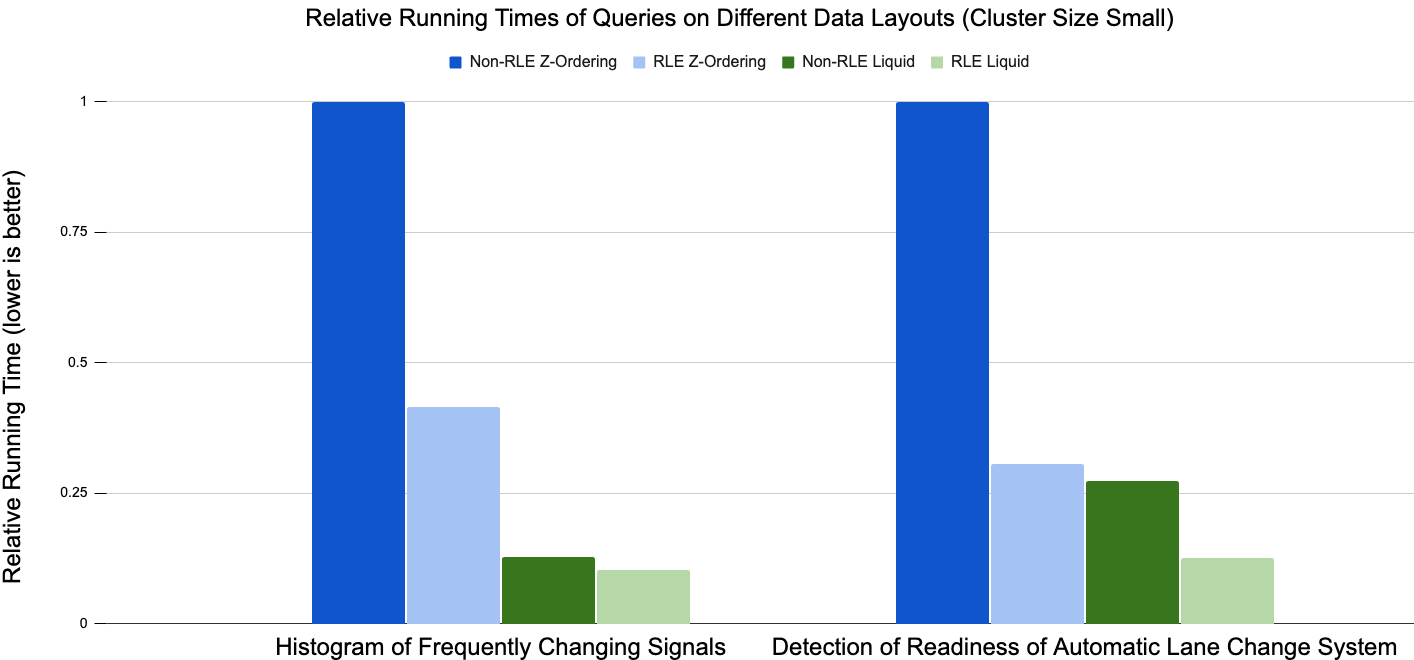 No segundo caso de uso, detecção de prontidão do sistema de mudança automática de faixa, o RLE reduziu o tempo de execução em quase 70% para Z-Ordering e em mais de 50% para Liquid Clustering. Os resultados gerais dos casos de uso demonstrados indicam que a combinação de RLE e Liquid Clustering tem o melhor desempenho no modelo de dados.