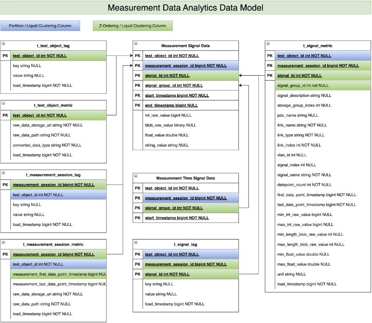 O benchmark foi executado em duas versões principais do modelo de dados. A primeira versão tem dados de amostras com codificação por comprimento de execução (RLE) (consulte a seção Modelo de Dados Principal), enquanto a segunda versão não usa RLE. Além disso, aplicamos duas otimizações de layout de dados diferentes a ambas as versões do modelo de dados. Na primeira otimização, usamos o particionamento no estilo Hive para particionar a tabela de dados de sinal de medição pela coluna measurement_session_id e aplicamos a técnica Z-Ordering na coluna signal_id. Na segunda otimização, usamos o Liquid Clustering para clusterizar a tabela de dados de sinal de medição por measurement_session_id e signal_id.