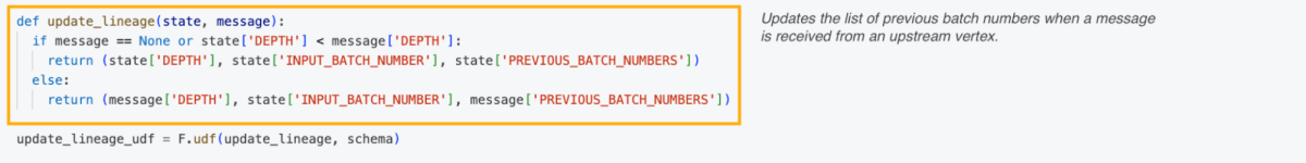 Funções definidas pelo usuário (UDFs) controlam como as mensagens são passadas e usadas para atualizar o estado de um vértice. Essa flexibilidade permite que os usuários implementem algoritmos Pregel para uma variedade de casos de uso. Para rastrear lotes em nosso processo de fabricação, enviamos o número do lote de entrada de um vértice para outro, atualizando a profundidade de cada vértice e os números do lote de origem quando uma mensagem era recebida.