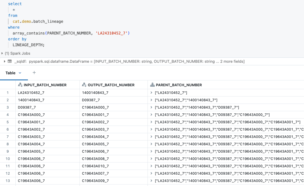 No entanto, os dados são massivos. Os sistemas de produção registraram mais de 1 bilhão de linhas com até 40 níveis de lotes de produção vinculados. Os métodos tradicionais de DataFrame não eram bem adequados para analisar essas relações a partir dos dados. A empresa considerou o uso de UDFs do Pandas, mas esses UDFs mostraram limitações de desempenho à medida que o tamanho e a complexidade dos dados aumentavam. Identificar relações profundamente aninhadas em um conjunto de dados tão grande exigiu a modelagem das relações como um gráfico. Uma solução construída com GraphFrames—um framework de processamento de gráficos distribuídos incluído no Databricks ML Runtime e otimizado com Databricks’ Photon Engine—realizou o rastreamento de lote de ponta a ponta com bom desempenho e escalabilidade.