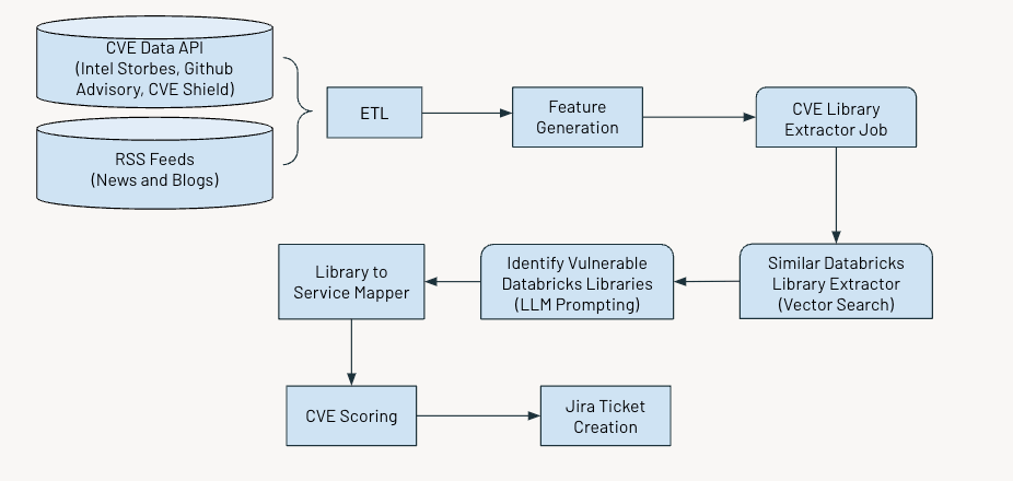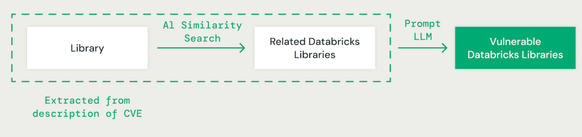 Utilizando a técnica de poucos exemplos (few-shot prompting) com um grande modelo de linguagem (LLM), extraímos a biblioteca relevante para cada CVE a partir de sua descrição. Posteriormente, empregamos uma abordagem de similaridade de vetor baseada em IA para combinar a biblioteca identificada com as bibliotecas Databricks existentes. Isso envolve converter cada palavra no nome da biblioteca em um embedding para comparação.