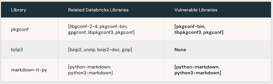 A tabela a seguir apresenta instâncias de bibliotecas Databricks vulneráveis vinculadas a um CVE específico. Inicialmente, a busca de similaridade por IA é usada para identificar bibliotecas intimamente associadas à biblioteca CVE. Posteriormente, um LLM é empregado para determinar a vulnerabilidade dessas bibliotecas semelhantes dentro do Databricks.