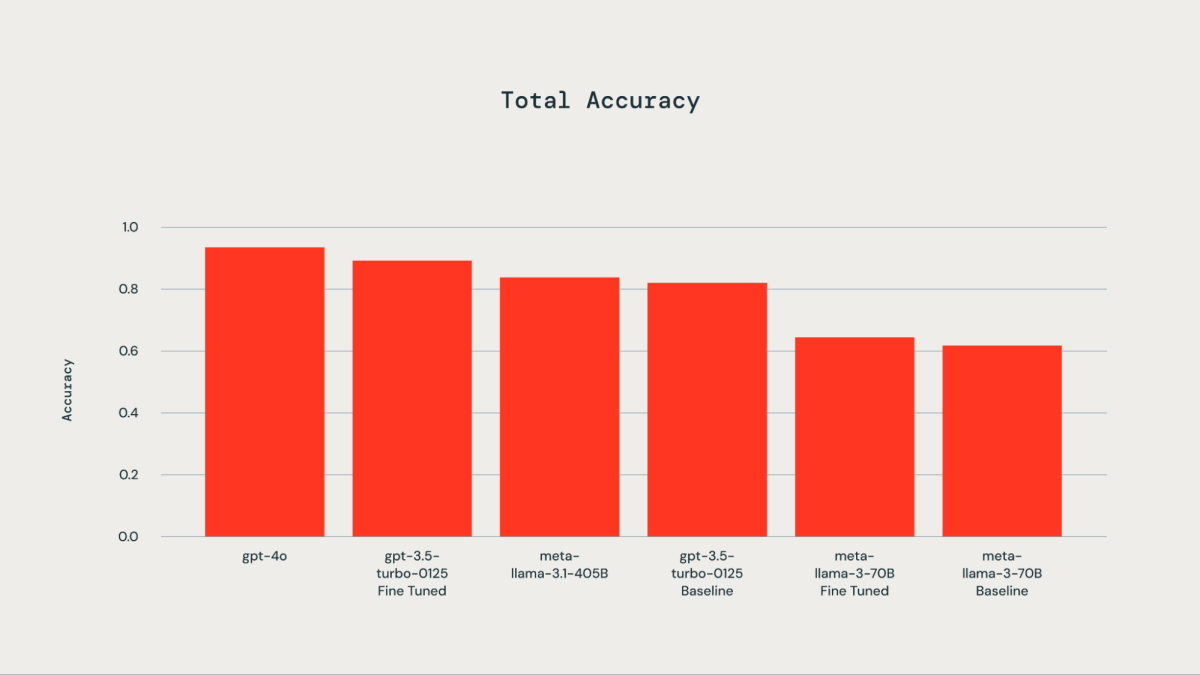 Um conjunto de dados de ground truth composto por 300 exemplos rotulados manualmente foi utilizado para fins de ajuste fino. Os LLMs testados incluíram gpt-4o, gpt-3.5-Turbo, llama3-70B e llama-3.1-405b-instruct. Como ilustrado pelo gráfico acompanhante, o ajuste fino do conjunto de dados de verdade básica resultou em uma precisão melhorada para o gpt-3.5-turbo-0125 em comparação com o modelo base. O ajuste fino do llama3-70B usando a API de ajuste fino do Databricks levou a apenas uma melhoria marginal sobre o modelo base. A precisão do modelo gpt-3.5-turbo-0125 afinado foi comparável ou ligeiramente inferior à do gpt-4o. Da mesma forma, a precisão do modelo instruído llama-3.1-405b também foi comparável e ligeiramente inferior à do modelo gpt-3.5-turbo-0125 afinado.
