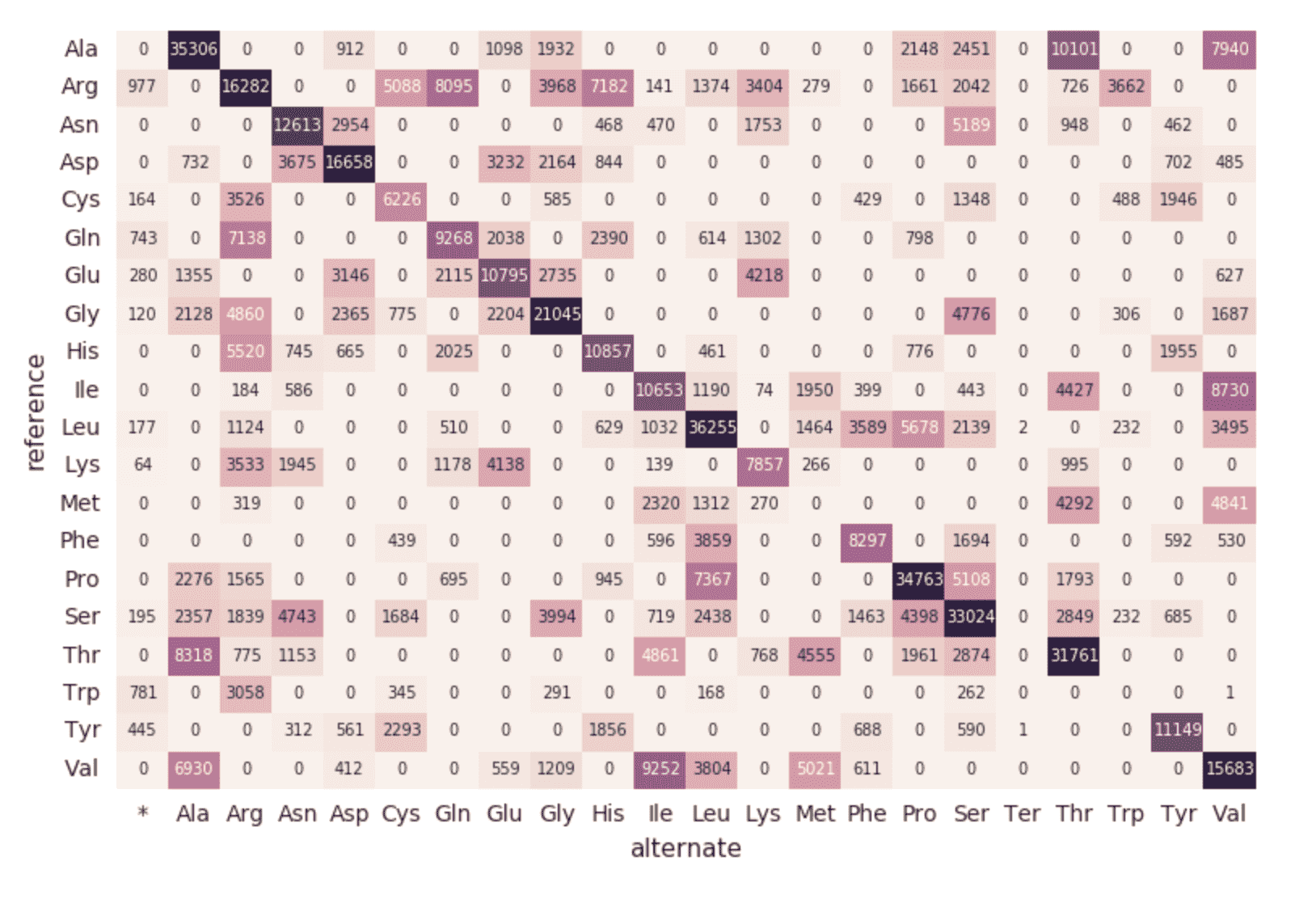 Fahren wir mit unserem exomes -DataFrame fort und berechnen wir die Anzahl der Aminosäuresubstitutionen mit dem folgenden Code-Snippet.  Ähnlich wie bei den vorherigen DataFrames erstellen wir einen weiteren dynamischen DataFrame (aa_counts), sodass, wenn neue Daten vom exomes-DataFrame verarbeitet werden, sich dies anschließend auch in der Anzahl der Aminosäuresubstitutionen widerspiegelt.  Wir schreiben die Daten auch in den Arbeitsspeicher (d. h. .format(“memory”)) und verarbeiten Batches alle 60 Sekunden (d. h. trigger(processingTime=’60 seconds’)), damit der nachgelagerte Pandas-Heatmap-Code die Heatmap verarbeiten und visualisieren kann.