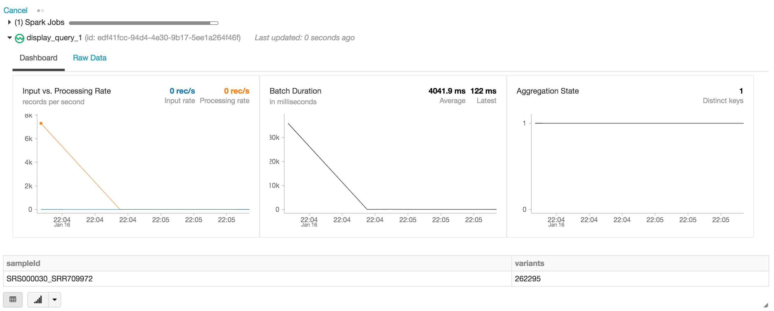 Bei der Ausführung der display -Anweisung stellt das Databricks-Notebook ein Streaming-Dashboard zur Überwachung der Streaming-Jobs bereit.  Direkt unter dem Streaming-Job befinden sich die Ergebnisse der display-Anweisung (d. h. die Anzahl der Varianten nach sample_id).