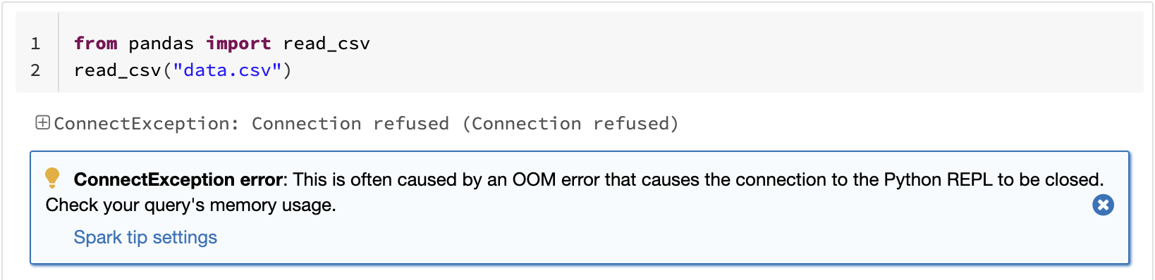 Eine der bekannten Einschränkungen von pandas ist, dass es aufgrund der Verarbeitung auf einem einzigen Rechner nicht linear mit dem Datenvolumen skaliert. Zum Beispiel tritt bei pandas ein Out-of-Memory-Fehler auf, wenn versucht wird, ein Dataset zu lesen, das größer ist als der auf einem einzigen Rechner verfügbare Speicher:
