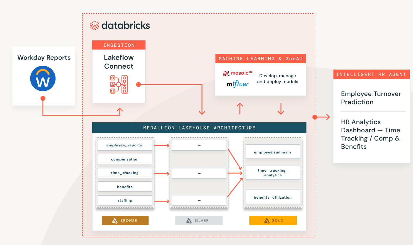 Für Personalabteilungen kann der Workday-Konnektor helfen, HR-Trends wie Mitarbeiterfluktuation zu verfolgen und vorherzusagen. Sie können beispielsweise relevante Workday-Berichte erfassen, sie mit DLT transformieren und die Ergebnisse in ein KI/BI-Dashboard integrieren.