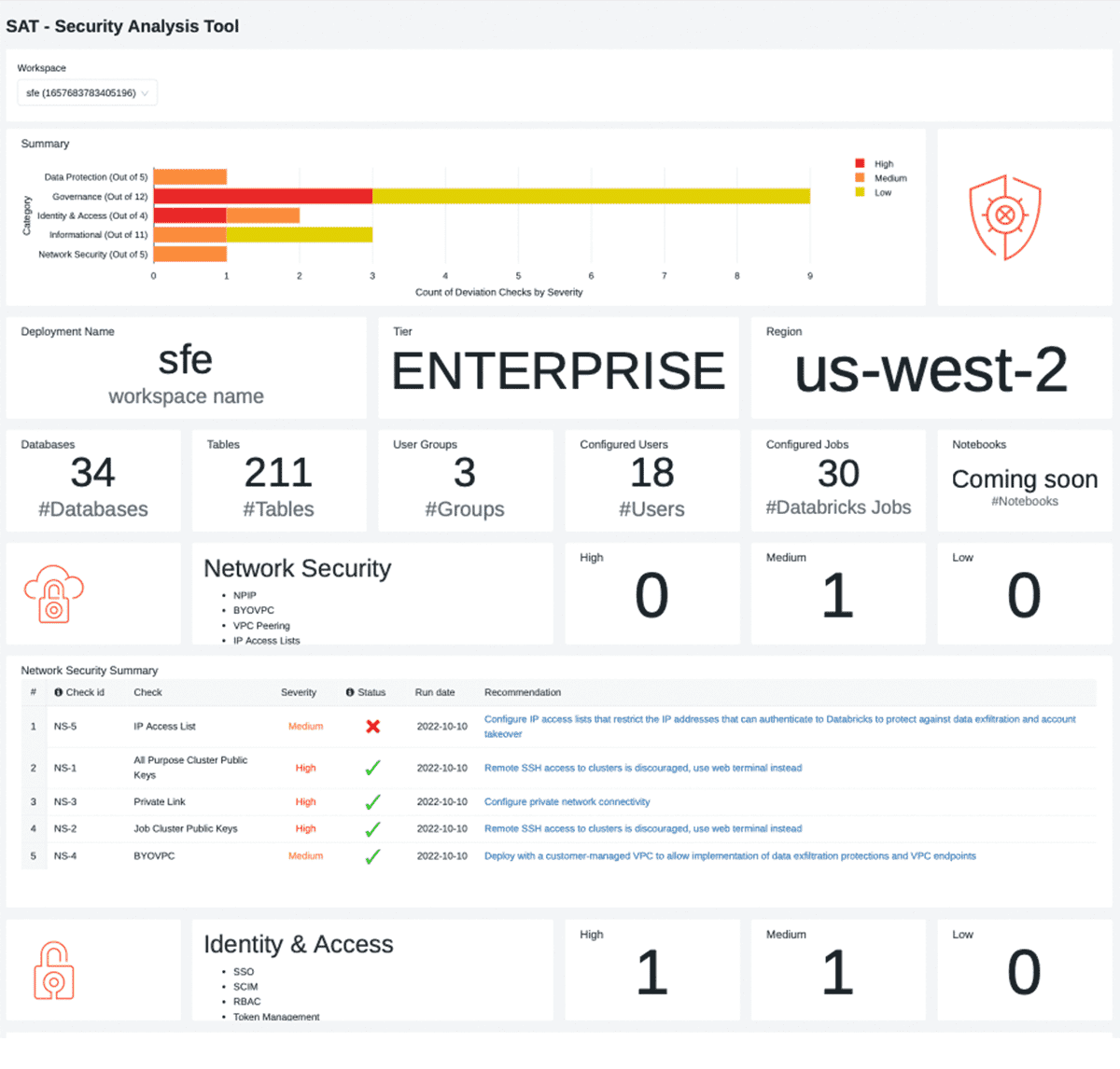 Wir freuen uns, das Security Analysis Tool (SAT) anzukündigen! SAT hilft unseren Kunden, diese Fragen zu beantworten und ihre Databricks-Deployments zu härten, indem es aktuelle Deployments anhand unserer bewährten Sicherheitspraktiken überprüft. Es verwendet eine Checkliste, die beobachtete Abweichungen nach Schweregrad priorisiert und Links zu Ressourcen bereitstellt, die Ihnen bei der Behebung offener Probleme helfen. SAT kann als Routine-Scan für alle Workspaces in Ihrer Umgebung ausgeführt werden, um die kontinuierliche Einhaltung von Best Practices sicherzustellen. Zudem können Zustandsberichte geplant werden, um fortlaufend Vertrauen in die Sicherheit Ihrer sensiblen Datasets zu gewährleisten.