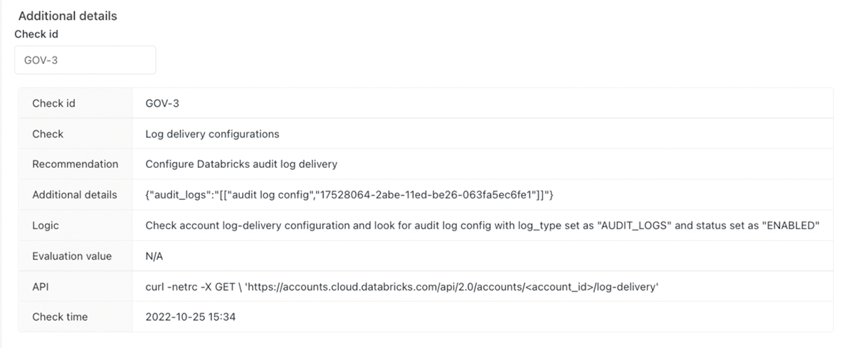 Im zweiten Beispiel heben wir ein Ergebnis hervor, das den Best Practices von Databricks entspricht – das grüne Häkchen in Abbildung 5. Die Prüfung Protokollbereitstellung ist grün, was bestätigt, dass der Workspace die Sicherheits-Best-Practices von Databricks befolgt. Auch hier kann die "Prüf-ID" ("GOV-3") im Abschnitt "Zusätzliche Details" verwendet werden, um detaillierte Informationen zu erhalten. Es sind keine weiteren Maßnahmen erforderlich, aber wir empfehlen dem Benutzer, diese Überprüfungen regelmäßig durchzuführen, um die Sicherheit des Databricks-Account-workspaces zu überprüfen und eine umfassende, kontinuierliche Verbesserung sicherzustellen.