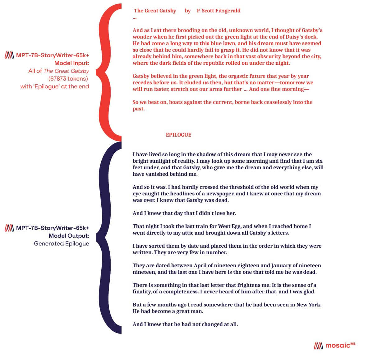 Wie sich herausstellt, hat der vollständige Text von Der große Gatsby knapp unter 68k Tokens. Also ließen wir StoryWriter natürlich Der große Gatsby lesen und eine Epilog generieren. Einer der von uns generierten Epiloge ist in Abbildung 2 dargestellt. StoryWriter hat Der große Gatsby in etwa 20 Sekunden gelesen (etwa 150.000 Wörter pro Minute). Aufgrund der langen Sequenzlänge ist seine „Tippgeschwindigkeit“ langsamer als bei unseren anderen MPT-7B-Modellen, etwa 105 Wörter pro Minute.