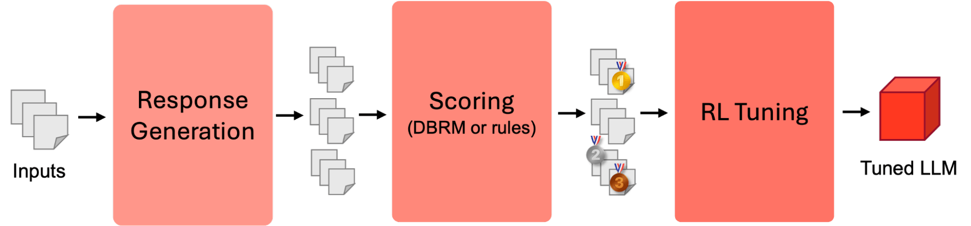 - Reinforcement Learning (RL)-Training: In der letzten Stufe wird ein RL-basierter Ansatz angewendet, um das LLM zu aktualisieren und das Modell so zu steuern, dass es Ausgaben produziert, die eng mit den in der vorherigen Stufe identifizierten, hoch bewerteten Antworten übereinstimmen. Durch diesen adaptiven Lernprozess verfeinert das Modell seine Vorhersagen zur Qualitätssteigerung.