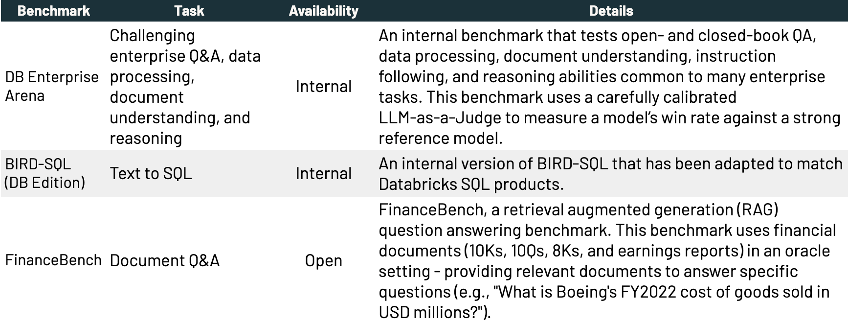 In diesem Abschnitt gehen wir näher darauf ein, wie wir TAO zur Optimierung von LLMs für spezialisierte Unternehmensaufgaben eingesetzt haben. Wir haben drei repräsentative Benchmarks ausgewählt, darunter beliebte Open-Source-Benchmarks und interne, die wir im Rahmen unserer Domain Intelligence Benchmark Suite (DIBS) entwickelt haben.