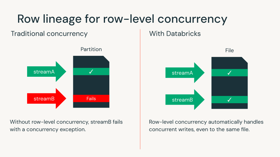With deletion vectors and row lineage, Databricks customers can now use row-level concurrency to detect write conflicts at the row level. This eliminates the need to design complex data layouts or coordinate workloads to ensure concurrency. Databricks remains the only lakehouse engine that brings this capability to open table formats.