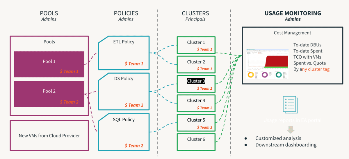 | Gestión de Clústeres | No Aplicable | No Aplicable | - Crear clústeres para varios roles/tamaños para roles de DE/ML/SQL para cargas de trabajo S/M/L - Eliminar el permiso de allow-cluster-create del grupo de usuarios predeterminado. - Crear Políticas de Clúster, otorgar acceso a las políticas a los grupos apropiados - Otorgar permiso Can_Use a los grupos para SQL Warehouses |