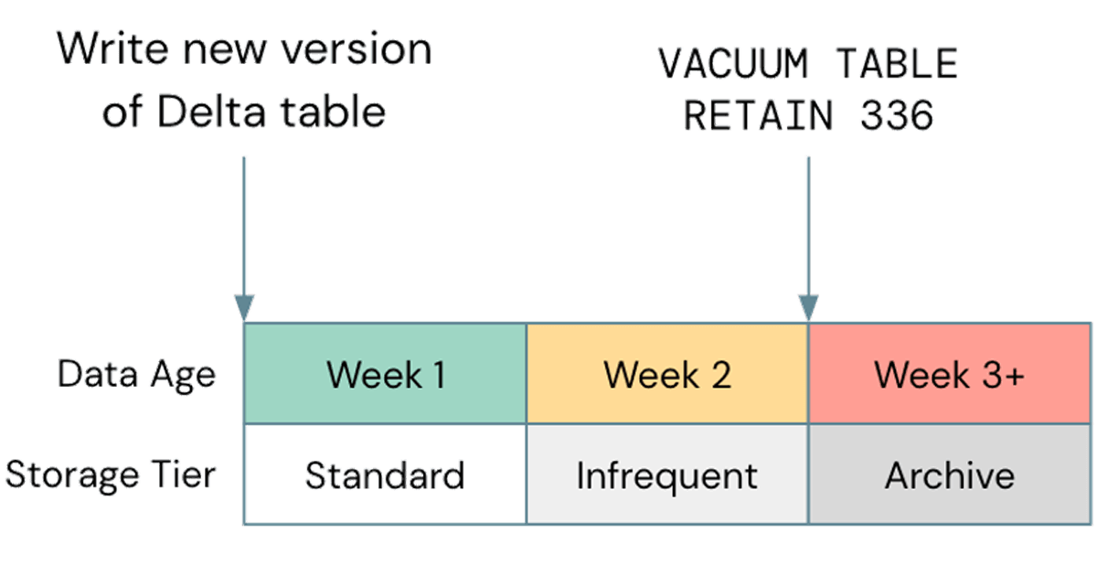 Ten en cuenta que los niveles de almacenamiento no estándar, como Glacier en S3 o Archive en ADLS, no son compatibles con Databricks, así que asegúrate de hacer Vacuum antes de que se utilicen esos niveles.