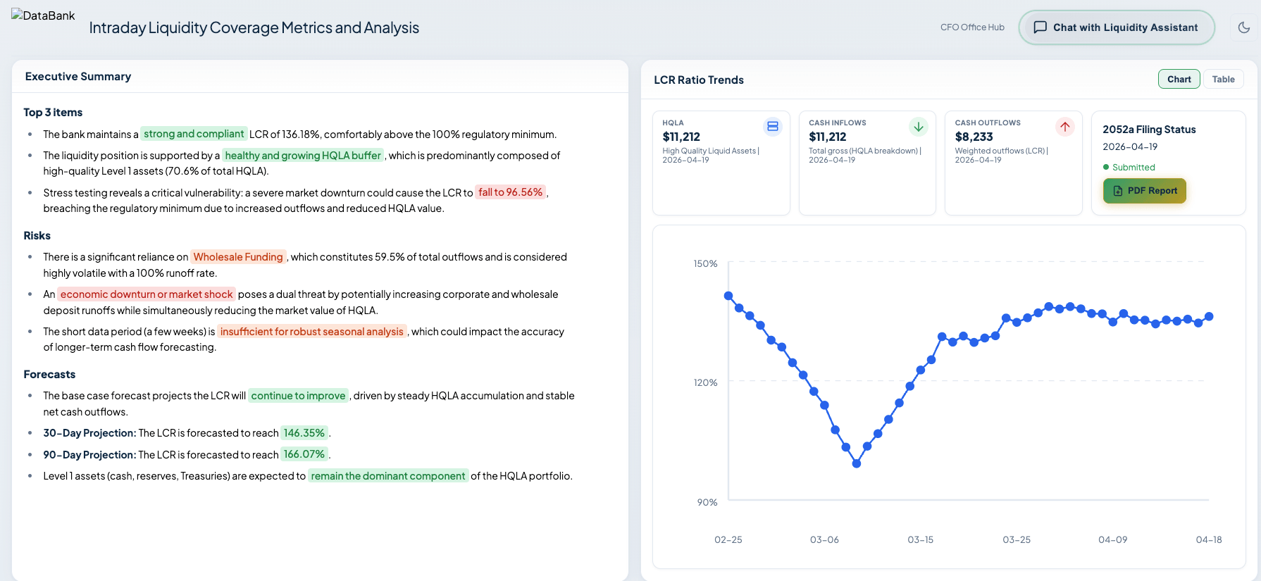 Financiación y Liquidez (LCR, ILST, FR 2052a): Utilizando un Centro de Datos Unificado que integra flujos de efectivo internos con datos de mercado de referencia, los equipos de Tesorería pueden monitorear la liquidez intradía y los riesgos de financiación a medida que ocurren. Los modelos predictivos de IA señalan posibles incumplimientos en los ratios de cobertura de liquidez (LCR) o las pruebas de estrés de liquidez internas (ILST) horas antes de que ocurran, lo que permite un reequilibrio proactivo.