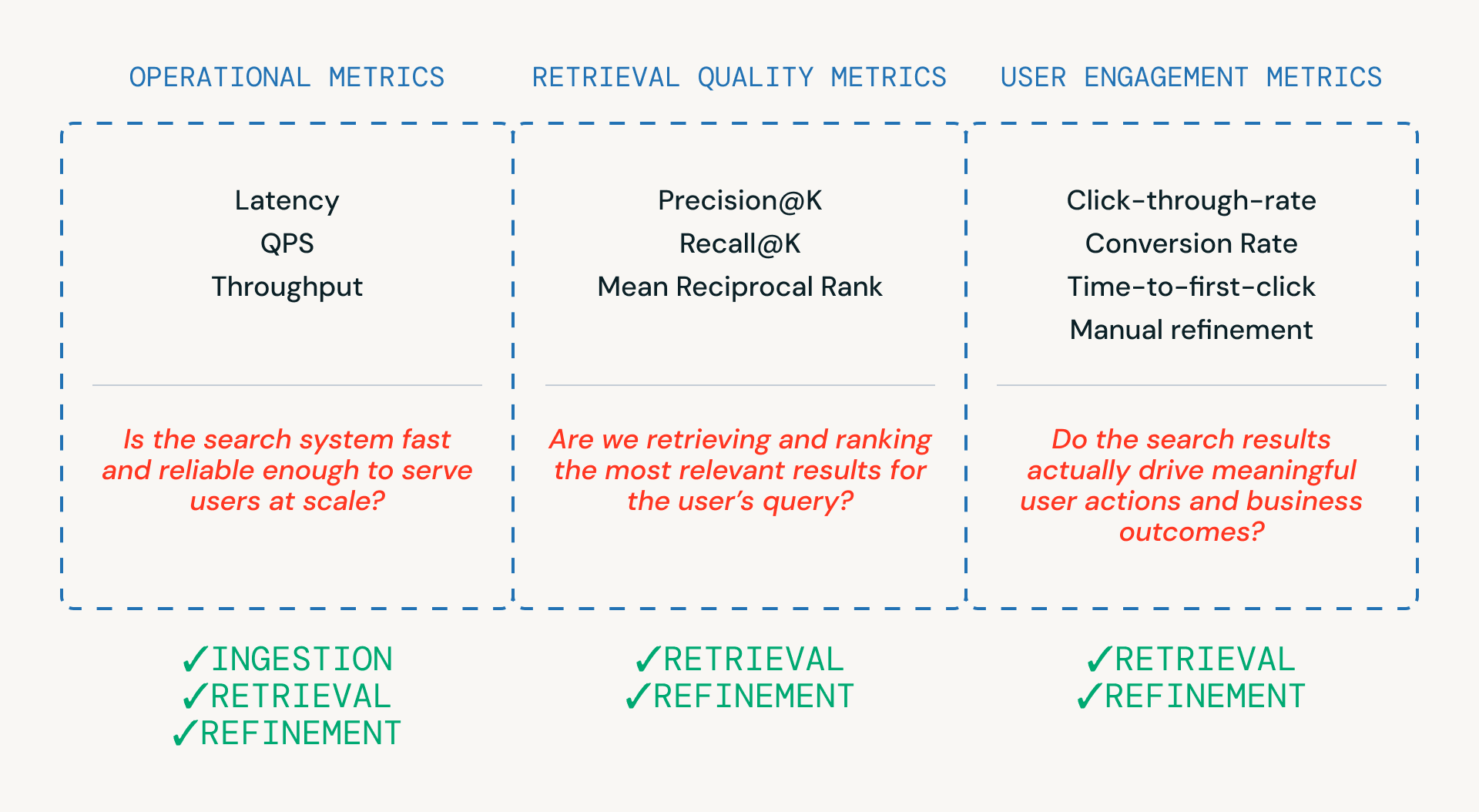 Como se muestra en la Figura 3, tres categorías de métricas ayudan a los equipos a evaluar un pipeline de búsqueda, cada una ligada a una capa diferente del sistema.