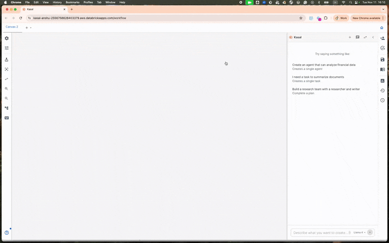 Kasal es un framework centrado en la UI para diseñar, ejecutar y observar flujos de trabajo de uno o varios agentes. En lugar de escribir manualmente un código de orquestación complejo, puedes arrastrar y soltar agentes en un lienzo visual o simplemente describir lo que quieres a través de un asistente conversacional. Kasal creará automáticamente el flujo de trabajo para ti. Luego, puedes conectar herramientas, ejecutar agentes y observar su comportamiento en tiempo real. Por detrás, Kasal utiliza CrewAI, un framework de Python de código abierto para crear y orquestar agentes de IA, pero lo envuelve en una capa de aplicación compatible con Databricks que gestiona la autenticación, la implementación y el monitoreo. Esto significa que el mismo flujo que diseñas visualmente se puede pasar a producción con un esfuerzo mínimo. El flujo generado también se puede exportar como código, lo que permite a los ingenieros de IA perfeccionarlo o ampliarlo aún más según sea necesario.