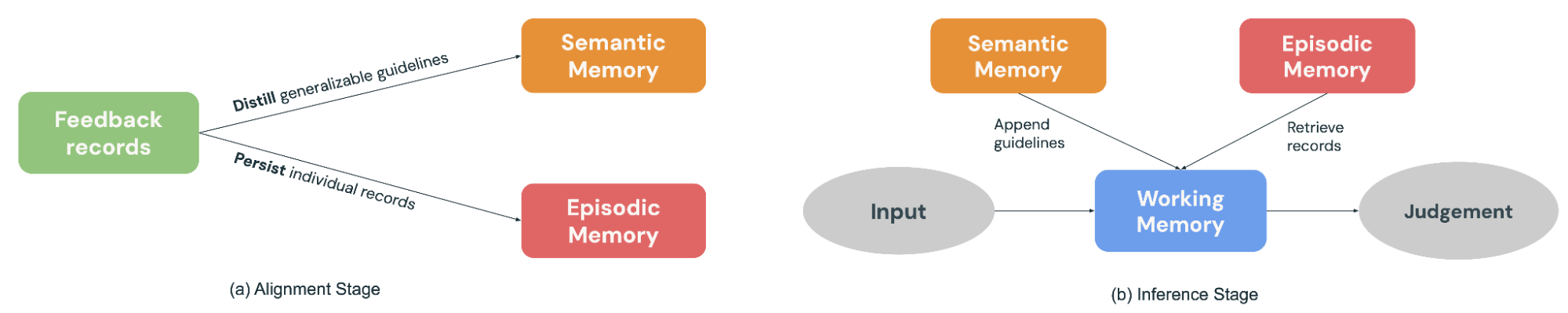 Cuando llega una nueva entrada para su evaluación (Figura 2b), MemAlign construye una Memoria de Trabajo (esencialmente un contexto dinámico) al recopilar todos los principios de la Memoria Semántica y recuperar los ejemplos más relevantes de la Memoria Episódica. En combinación con la entrada actual, el juez LLM hace una predicción informada por el “conocimiento” y las “experiencias” pasadas, al igual que los jueces reales tienen un libro de reglas y un historial de casos para consultar en la toma de decisiones.