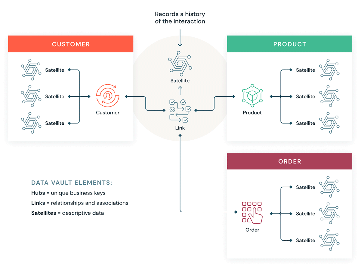 Un schéma montre comment fonctionne la modélisation Data Vault, avec des hubs, des Links et des satellites connectés les uns aux autres.