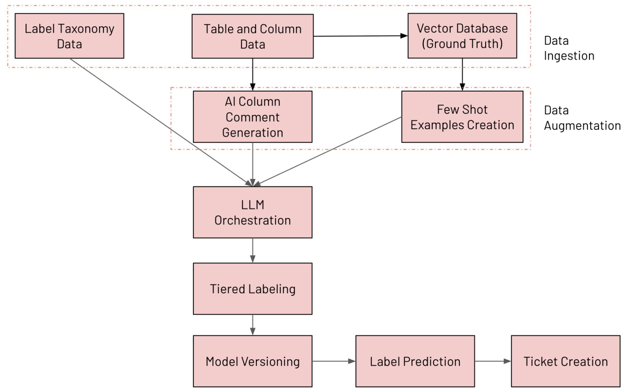 Nous avons développé sur Databricks un système de classification de colonnes basé sur un LLM qui annote en continu les tables à l'aide de notre taxonomie de données interne, détecte la dérive de l'étiquetage et ouvre des tickets de correction lorsqu'une anomalie est détectée. Les différents composants du système sont décrits ci-dessous (suivis et évalués à l'aide de MLFlow) :