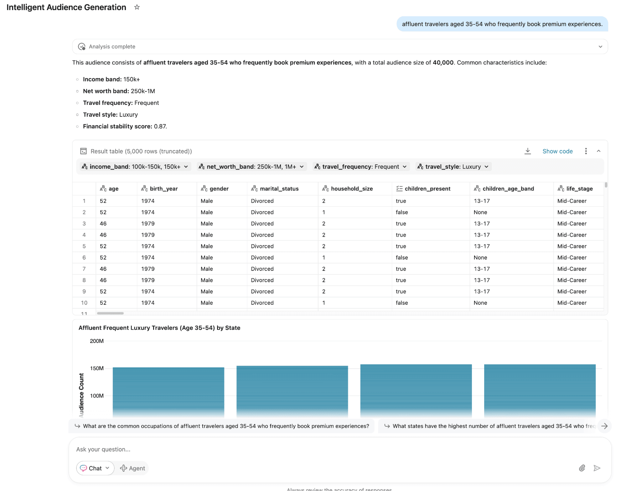 Prenons un exemple pour rendre cela concret, où un planificateur de campagne prépare un brief pour une marque de voyages de luxe promouvant des forfaits de villégiature exclusifs. Le brief demande « des voyageurs aisés âgés de 35 à 54 ans qui réservent fréquemment des expériences premium ». Traditionnellement, ce brief arrive sur le bureau d'un analyste, qui le traduit en requêtes SQL pour segmenter les audiences et effectuer des analyses ad hoc. Bien que ce soit une approche raisonnable, elle réduit inévitablement l'intention stratégique à une poignée d'attributs familiers.
