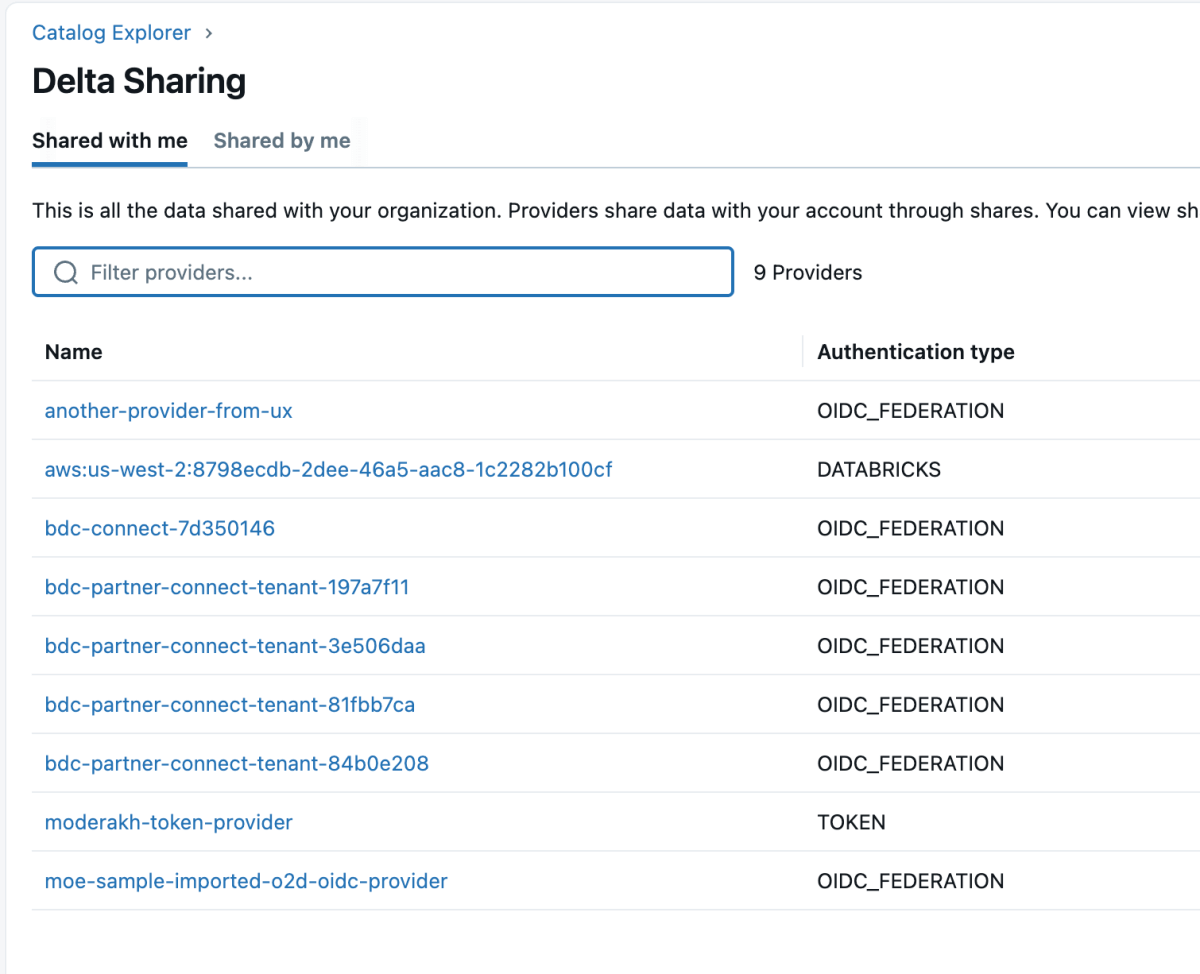 4 : Une fois le produit de données partagé, il apparaîtra comme un partage delta (delta share) dans l'espace de travail Databricks, comme indiqué ci-dessous. Assurez-vous d'avoir l'accès « Use Provider » pour voir ces fournisseurs.