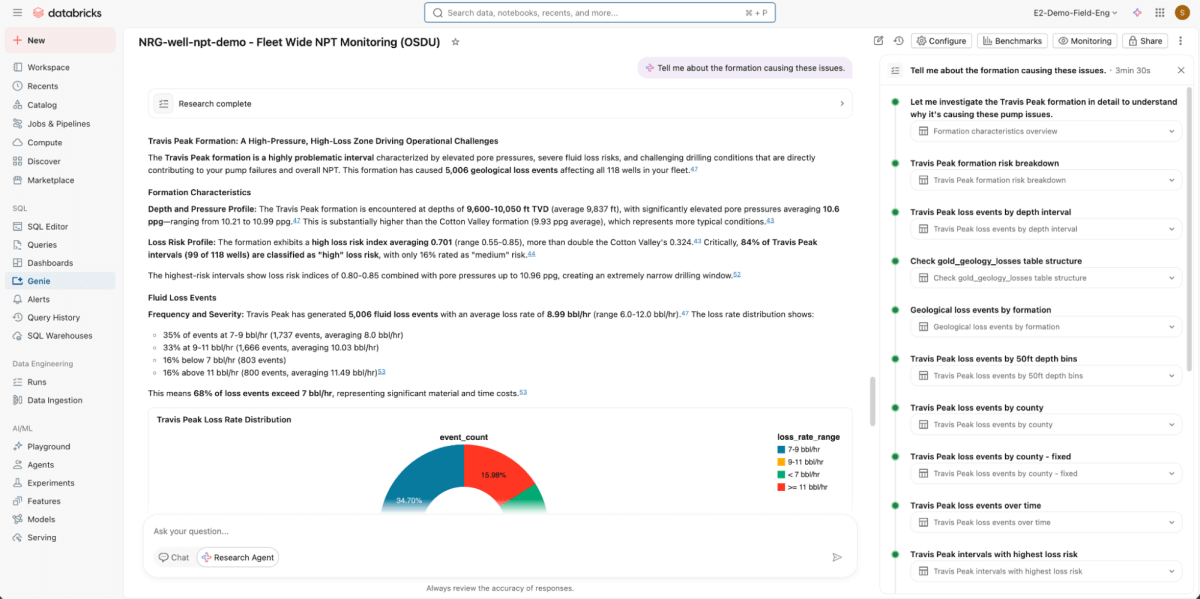 • Briser les silos de données : En unifiant les journaux de puits OSDU, les données IoT en temps réel des plateformes et le contexte métier des systèmes ERP dans le Databricks Lakehouse, Genie Research Agent devient un lieu unique pour explorer des questions opérationnelles, financières et géologiques sans avoir besoin de savoir où résident les données ou comment elles sont structurées.