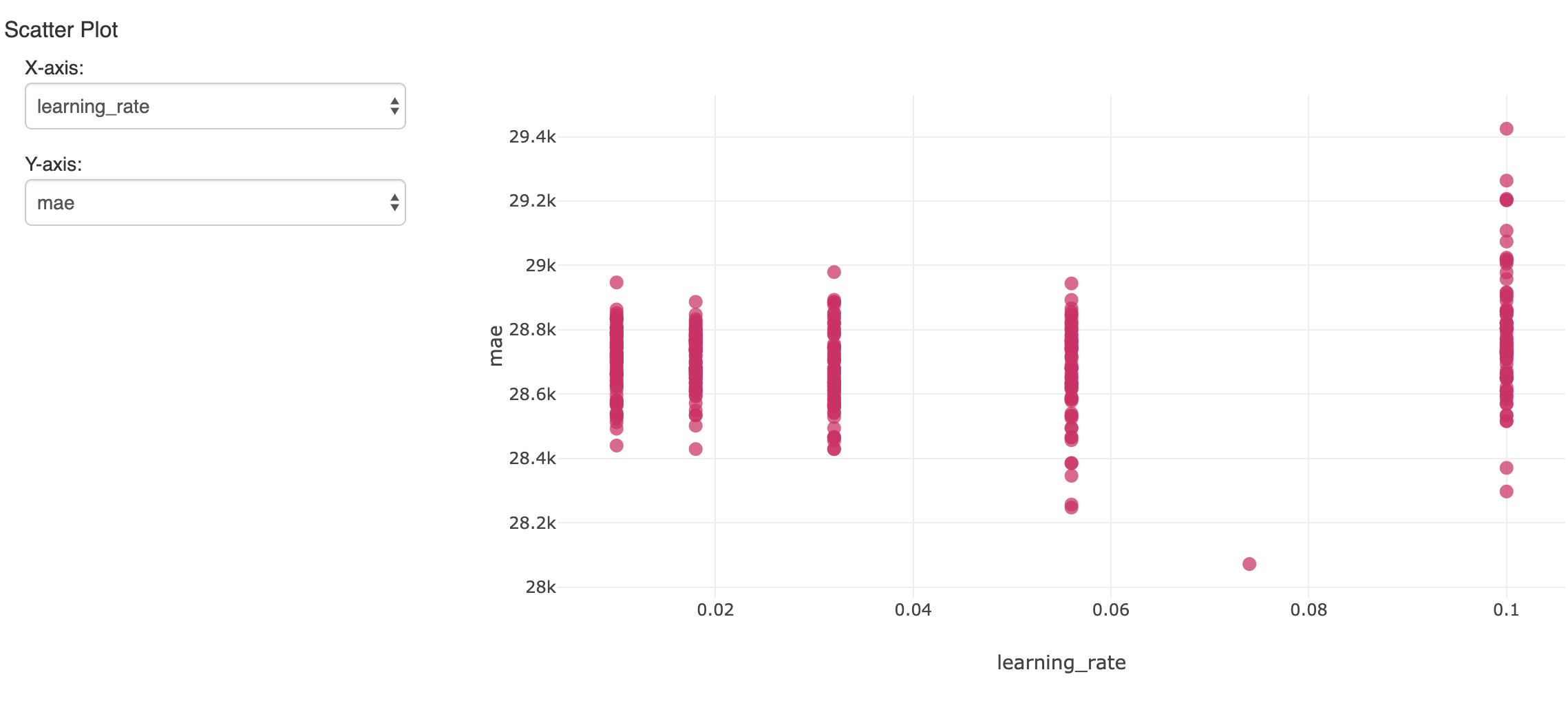 Questo creerà molti modelli. Per tracciare e valutare i risultati, mlflow può loggare ciascuno di essi con le relative metriche e iperparametri e visualizzarli nell'Experiment del Notebook. Qui, un iperparametro su più esecuzioni viene confrontato con l'accuratezza risultante (errore assoluto medio):