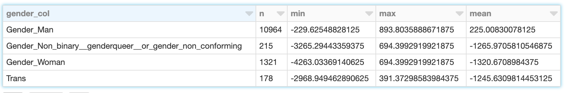 I valori SHAP vengono computati in modo indipendente per ogni riga, dato il modello, e quindi questo avrebbe potuto essere fatto anche in parallelo con Spark. L'esempio seguente calcola i valori SHAP in parallelo e individua in modo simile gli sviluppatori con valori SHAP sproporzionati legati al genere:
