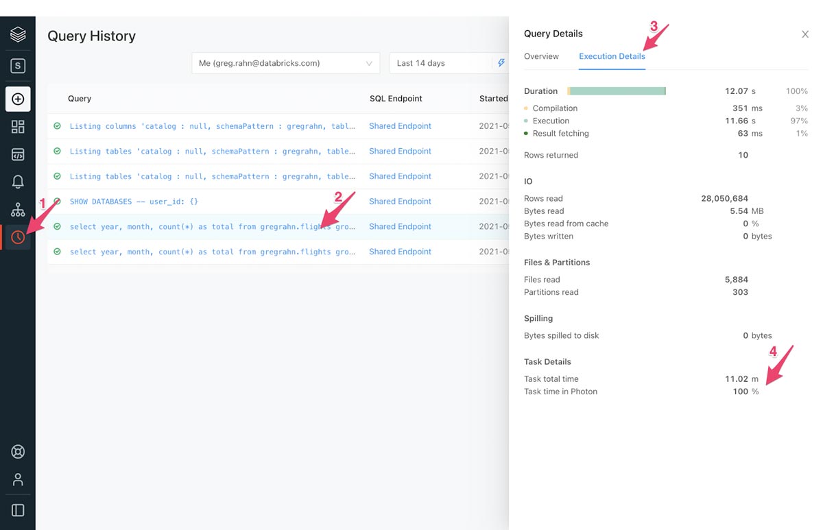 Se utilizzi Photon su Databricks SQL, è facile vedere quale parte di una query è stata eseguita utilizzando Photon: