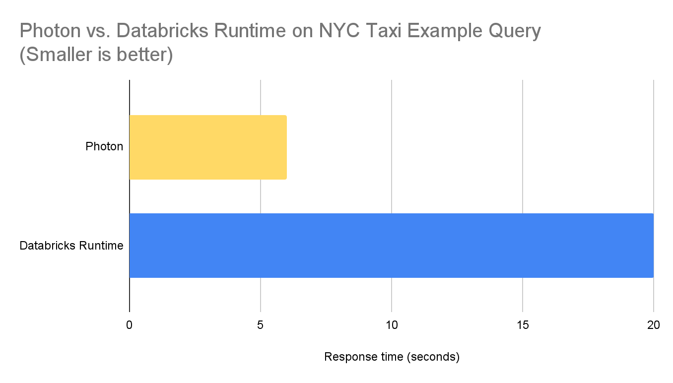 Abbiamo misurato il tempo di risposta della query precedente con Photon e un Databricks Runtime convenzionale su un cluster AWS preriscaldato con 2 executor i3.2xlarge e un driver i3.2xlarge. Ecco i risultati.
