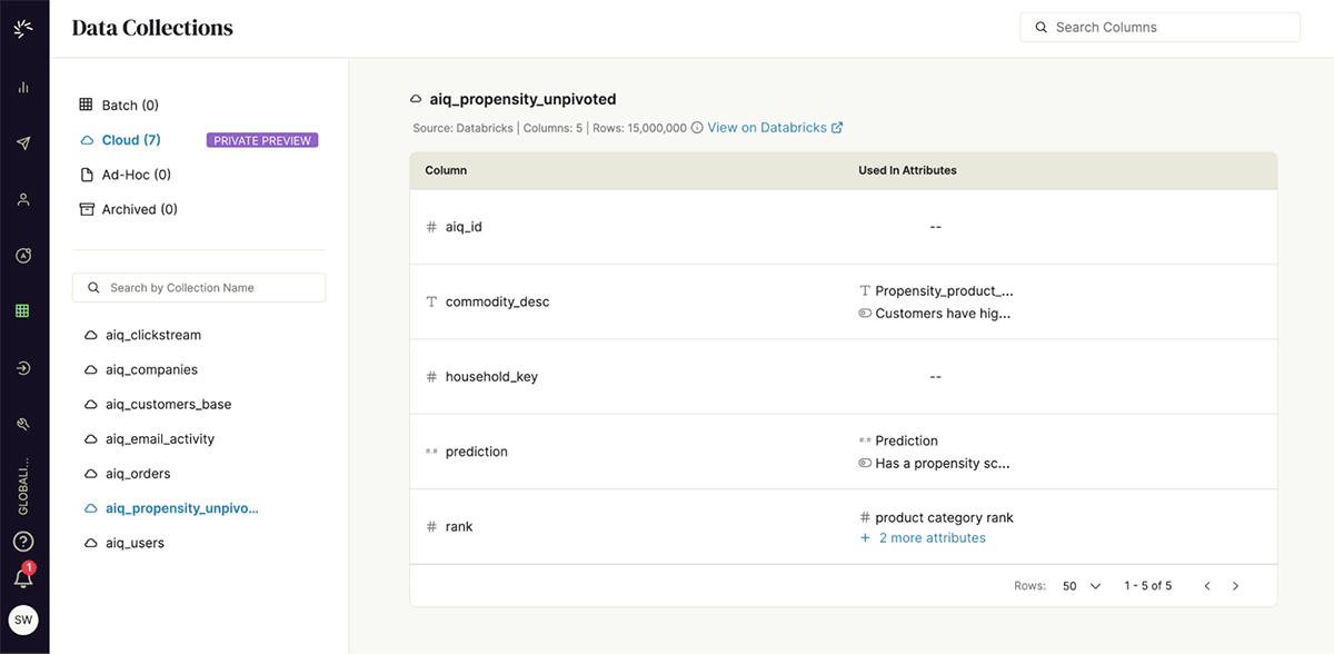 Per abilitare il flusso di lavoro del team di marketing con questi dati, gli amministratori della CDP hanno configurato una connessione senza interruzioni tra la piattaforma ActionIQ e Databricks, sfruttando l'integrazione HybridCompute di ActionIQ. Contemporaneamente, gli amministratori di Databricks hanno impostato le autorizzazioni sugli oggetti appropriati per consentire l'esecuzione di query provenienti da ActionIQ. Il team di marketing non ha bisogno di conoscere questi dettagli tecnici. Per loro, i dati del propensity score appaiono semplicemente come una fonte di dati dei clienti all'interno dell'interfaccia utente di ActionIQ. (Figura 2).