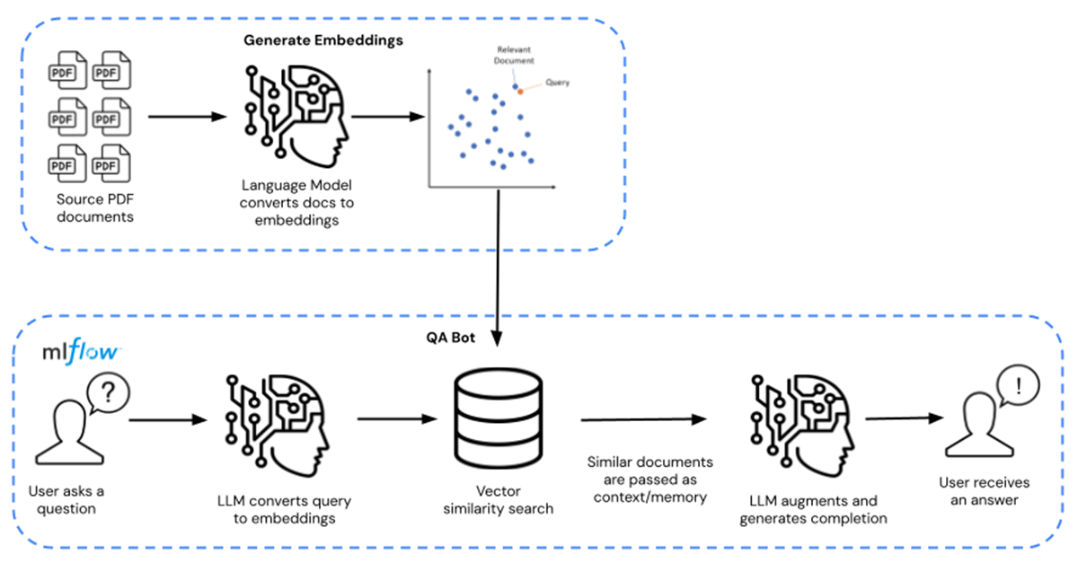 In questo acceleratore di soluzioni, l'LLM è potenziato con schede informative chimiche distribuite in formato PDF disponibili pubblicamente. Può essere sostituito con qualsiasi dato proprietario a tua scelta. Le schede informative vengono trasformate in embedding e utilizzate come retriever per il modello. Langchain è stato quindi utilizzato per compilare il modello, che viene poi ospitato su Databricks MLflow. Il deployment assume la forma di un endpoint di Model Serving di Databricks con capacità di inferenza GPU.