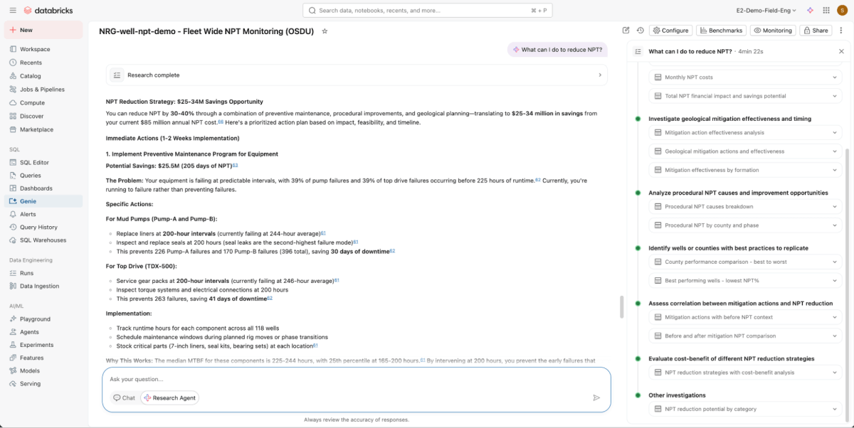 Tradizionalmente, gli ingegneri dell'affidabilità e i team del sottosuolo avrebbero eseguito analisi separate, per poi cercare di riconciliare manualmente i risultati. Con tutti i dati unificati su Databricks ed esposti tramite Genie, il sistema correla modalità di guasto, MTBF, esposizione alla formazione, proprietà del fango e cronologia della manutenzione in un'unica analisi multi-step.