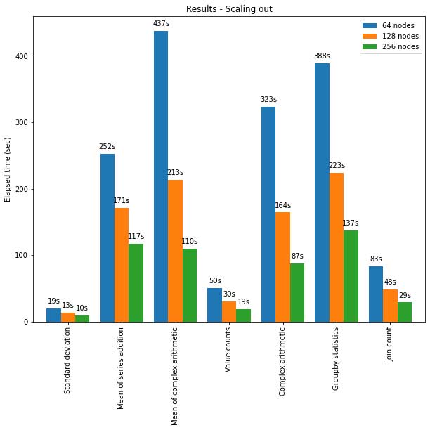 pandas API on Spark は、Spark エンジンの最適化のおかげで、単一のマシンでも pandas を上回るパフォーマンスを発揮することがよくあります。下のグラフは、130GB の CSV データセットに対して、Spark 上の pandas API と、マシン(96 vCPU、384 GiB メモリ)上の pandas を比較したものです: